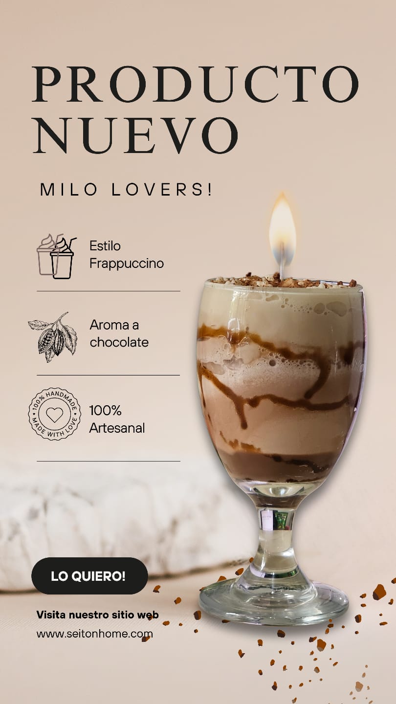 Una delicia para los sentidos. Nuestra vela Milo Frío está inspirada en la icónica bebida de chocolate que nos acompaña desde la infancia, ahora transformada en una pieza decorativa irresistible. Elaborada a mano, su diseño realista en copa de vidrio simula a la perfección un milo espeso con crema batida, remolinos de sirope y virutas de chocolate.