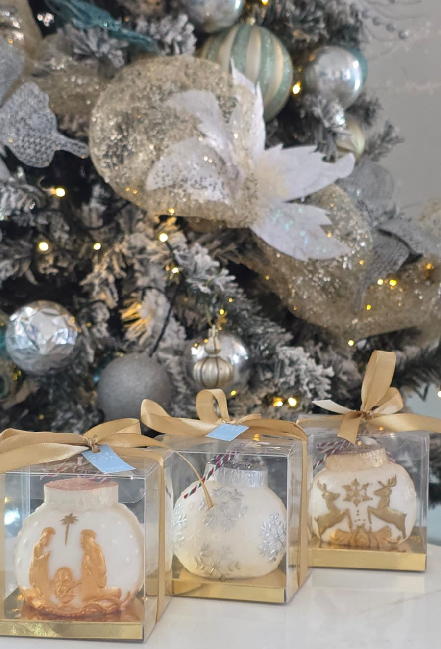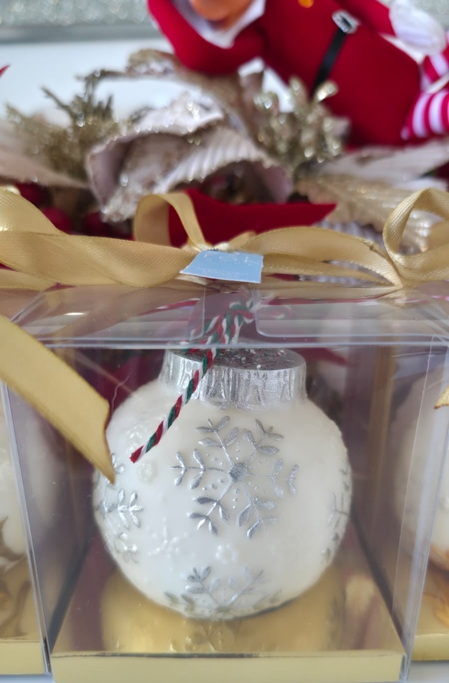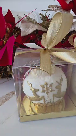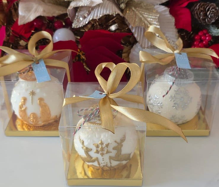 Esta vela decorativa en forma de esfera imita la apariencia clásica de una bola navideña. Disponible en colores blanco, rojo y azul con delicados detalles dorados, ofrece un toque sofisticado y festivo para cualquier ambiente. Con un diámetro aproximado de 8 cm, es ideal para complementar la decoración navideña con elegancia y calidez.